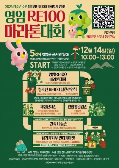 안녕하세요! 영암군에너지센터입니다 12월 14일 10:00~13:00까지 영암 RE100마라톤대회가 개최됩니다!누구나 참여 가능합니다! 다양한 부대 행사도 마련되어있으니많은 참여 부탁 드려요!사진 클릭하시거나 하단링크눌러주시면 참가신청으로 진행됩니다!