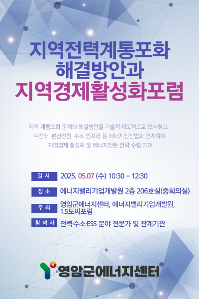 안녕하세요 영암군에너지센터입니다!5월7일 에너지좌담회가 개최되는데요!지역전력계통포화 해결방안과 지역경제활성화라는 주제로 진행될 예정입니다.많은 관심바랍니다!