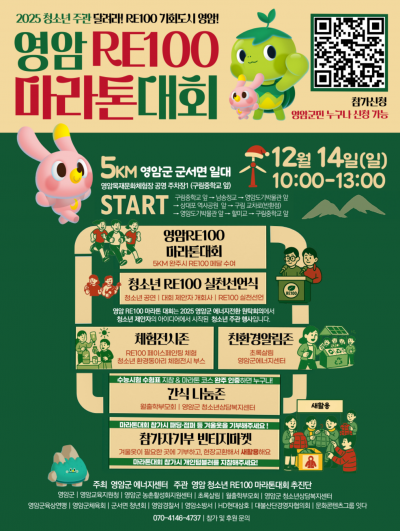 안녕하세요! 영암군에너지센터입니다 12월 14일 10:00~13:00까지 영암 RE100마라톤대회가 개최됩니다!누구나 참여 가능합니다! 다양한 부대 행사도 마련되어있으니많은 참여 부탁 드려요!사진 클릭하시거나 하단링크눌러주시면 참가신청으로 진행됩니다!